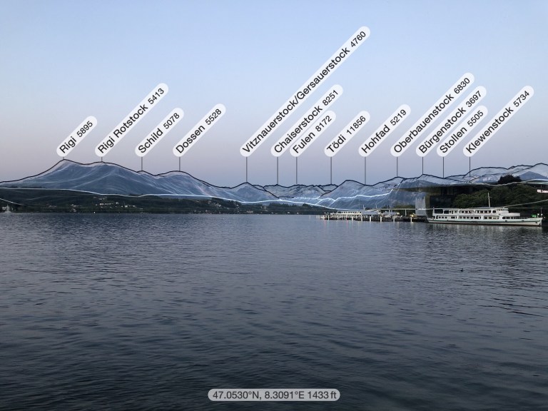 Looking out from the bridge and using the Peak Finder app, it displays the names and heights of the peaks. It’s about 9:30pm but the mountains are still visible.