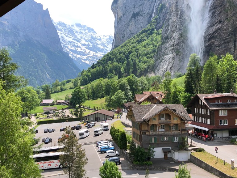 We disembarked at Interlaken (Inter = “between” , laken =”lakes”), situated between Lake Thun and Lake Brienz) so we could 1) buy a ticket to Lauterbrunnen and 2) go across to the Coop to buy something for lunch. Interlaken is a good sized city, but there were a lot of tour busses waiting or arriving to pickup groups off the train. Fortunately our train to Lauterbrunnen was not full and it was only a 20 minute trip from Interlaken to Lauterbrunnen. Summertime is busy tourist season for these small towns.