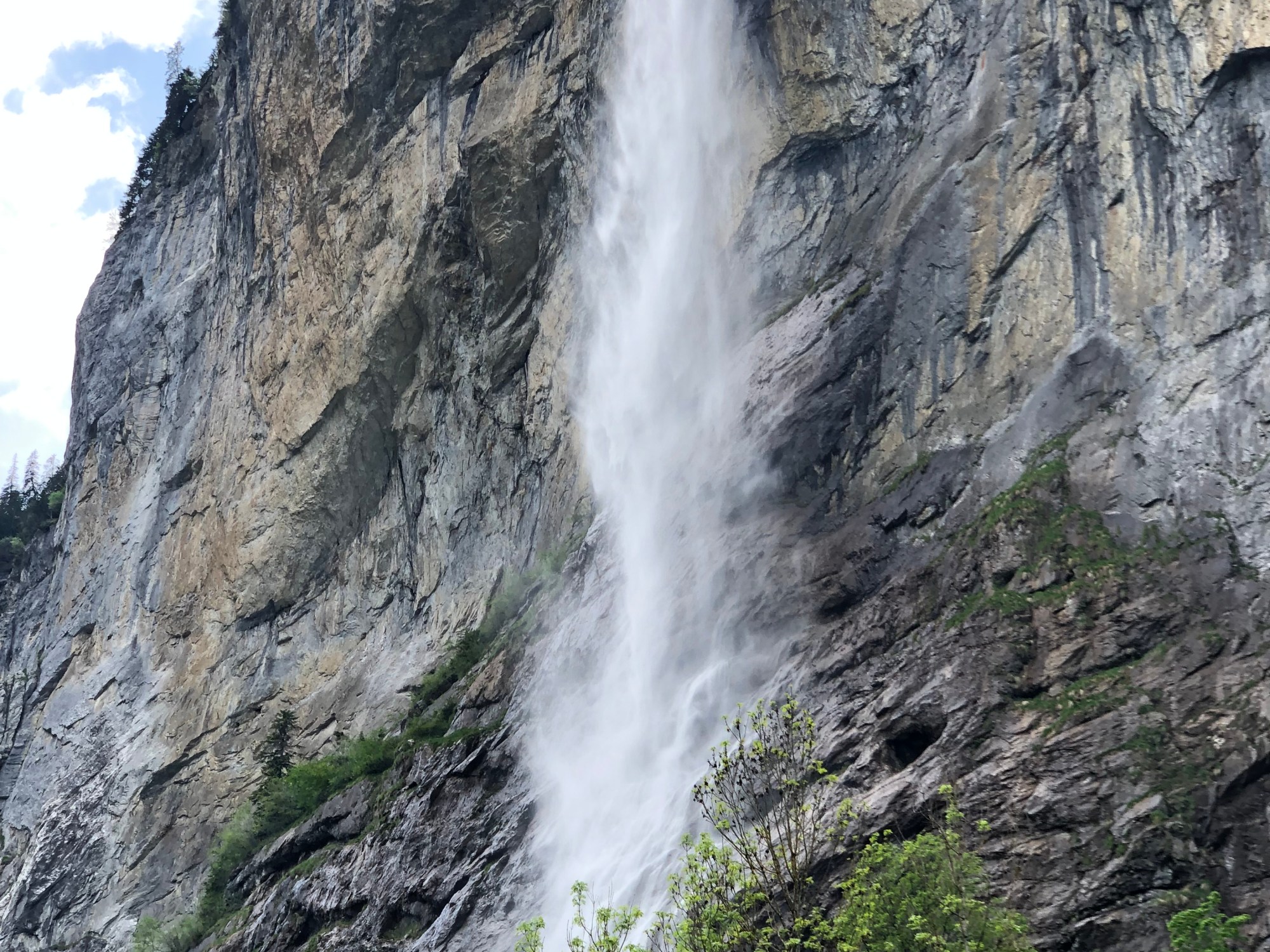 We took a walk down “Main Street” which turns into a mostly one lane road and then a path as it leads you out of town, past Staubbach Falls, Camping Jungfrau and the farms that scatter across the valley floor. As you walk out of town, you’ll discover even more waterfalls, as the Lauterbrunnen valley is home to 70 some odd waterfalls depending on the snow melt. This year was apparently a heavy winter and late spring, with snowfall as late as May. Staubbach Falls in particular seems particularly voluminous in its water flow. In fact the entrance to go up behind the falls are closed, probably due to the amount of water coming down the cliff (the cave entrance comes from behind the waterfall about a third of the way up).