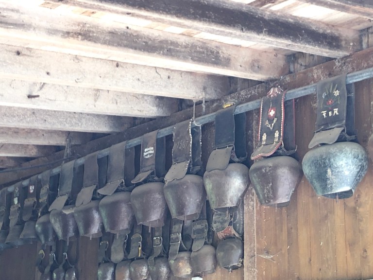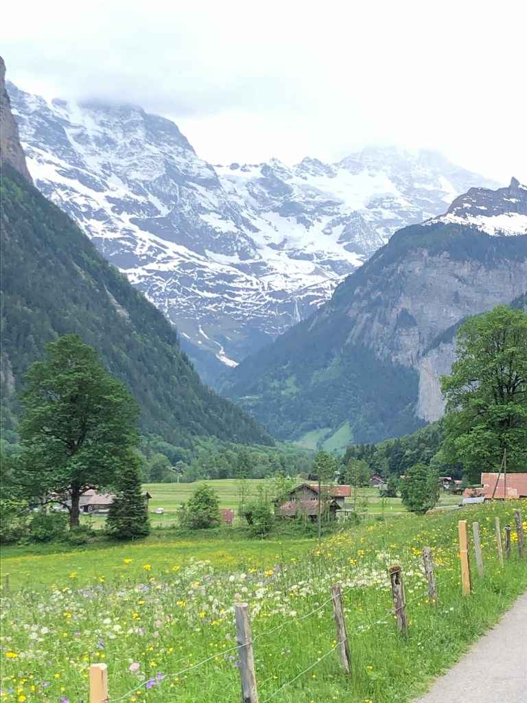 The trip from Luzern to Interlaken is about 2 hours and full of beautiful scenery. We gradually rose in elevation (my ears popped at one point) and the mountains that were a few thousand feet in height became 6-8,000′ with snow caps. On the lower elevations, you can see houses and barns spreading out above in the alpine meadows.
