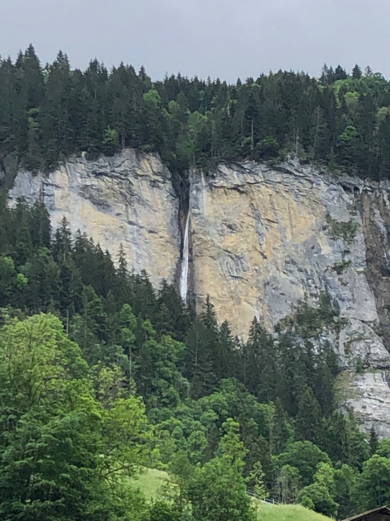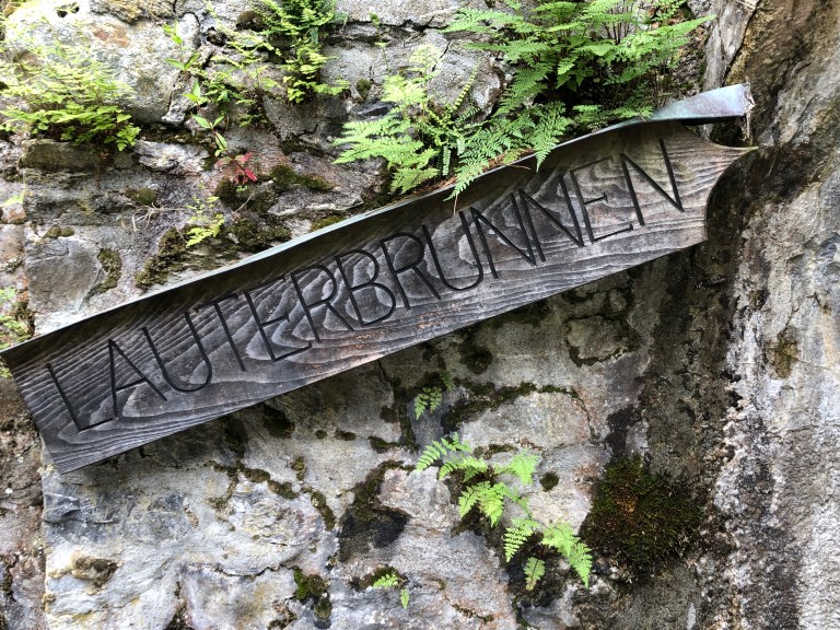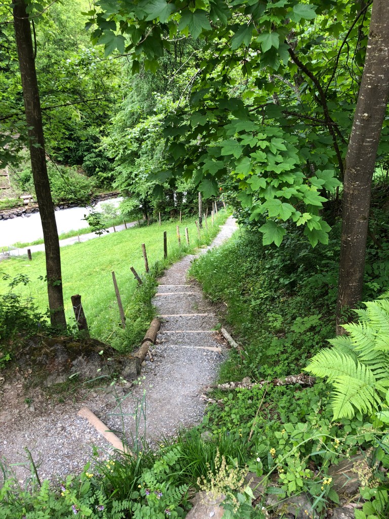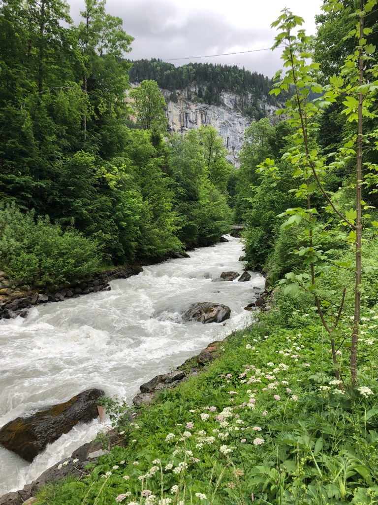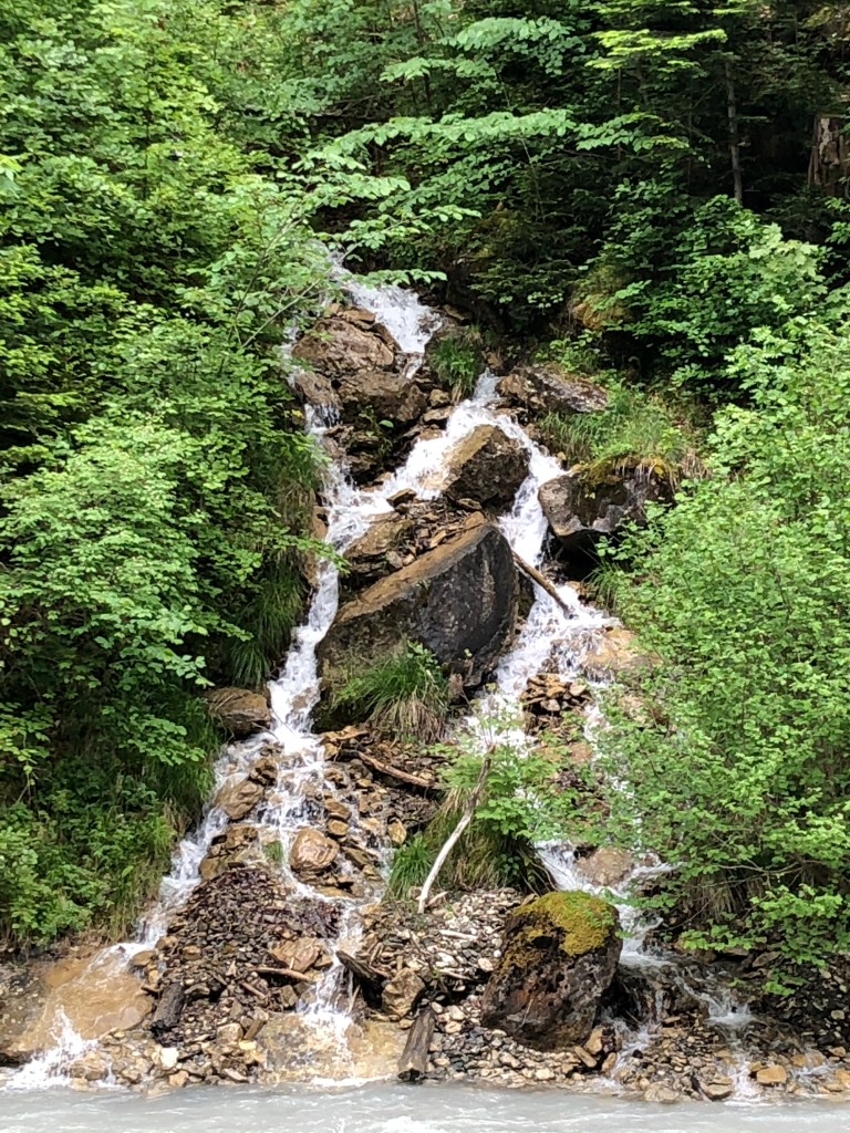 We’ve hiked alongside the Lütschine going out the Lauterbrunnen valley one direction on an earlier visit, so this time we went the opposite direction, towards Zweilütschine, where the Weisse (White) Zweilütschine Lütschine and the Schwarze (Black) Lütschine rivers meet. (Zwei=Two Lütschines) is where we changed trains at one point in the past when we visited Grindelwald. We won’t go as far as Zweilütschine today, but probably 30 minutes out.