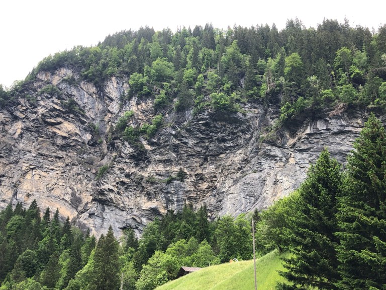 The early morning fog cleared up, but the clouds remain so going out to the Schilthorn isn’t going to be worthwhile, you’d be in the clouds. To reach the Schilthorn, you take the Lauterbrunnen-Murren cable car up to Murren (located on a plateau on one side of the valley) , then take the train across to the Schilthorn, but that’s all for naught if you can’t see anything, and it’s the same for going up to the Mannlichen or the Jungfrau. So we elected to take a hike alongside the Lütschine River which runs through Lauterbrunnen.