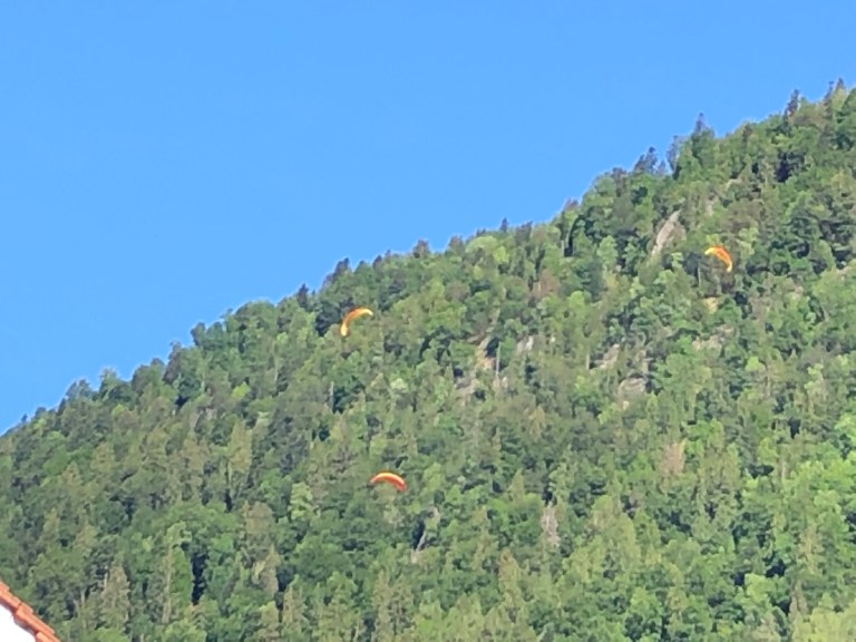 In Interlaken, there are at least eight paragliders overhead when we exit the rail station. It’s a clear blue sky and perfect for this.