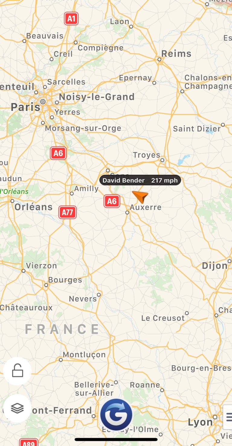 Outside Dijon, the TGV gains back some speed, but at 106mph, well below the 200mph we reached earlier. Now racing back up to 217mph, the scenery rips past; cars on parallel roads seem like they’re standing still. Except for slowing to go through cities (train would probably blow people off the platforms if they didn’t), can’t see why the speed will vary 30-40mph in a relatively short span, though probably averaging 180mph. Speed in an airplane at 30,000′ seems mostly without a frame of reference. When you’re ten feet above ground level, though it doesn’t feel ~200 in an absolute sense, you can better sense speed.