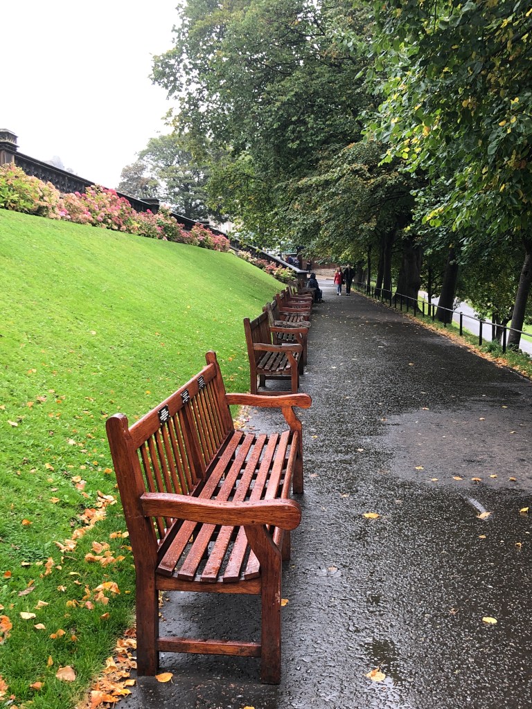 We traveled from Glasgow to Edinburgh this morning, escaping the light rain showers that started about the time we left. Our ScotRail train was a short 49 minute ride. We didn’t have time to eat breakfast before we left Glasgow this morning and we left from the Queens Street station (rather than Central) , which is under construction (so no food there). We found the usual selections in the Edinburgh Waverley station, so we ate there before venturing out to find our hotel.