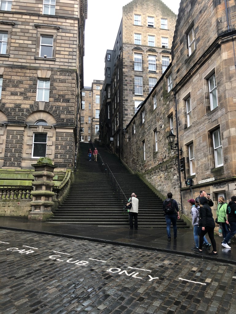 We wanted to head up to the Royal Mile, a pedestrian shopping area which is up behind the buildings in the first picture above. Being on the steep hill, it’s easier to walk up the street that winds up than going up at a steep angle on the steps.