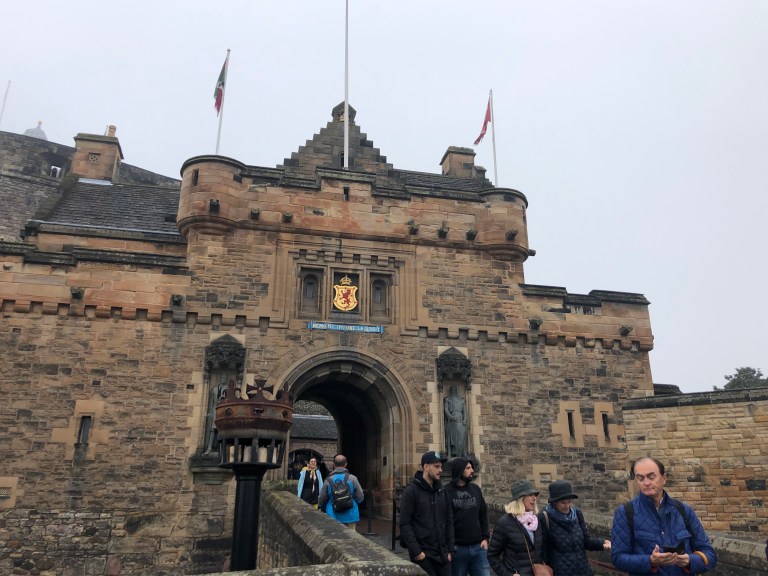 Ahead of us is Edinburgh Castle. It’s too late to plan to go in today as they’re closing in a couple of hours, but we’ll wander around in the courtyard in front, where they’ve started taking down the massive scaffolds for the seating for the Tattoo.