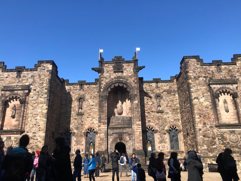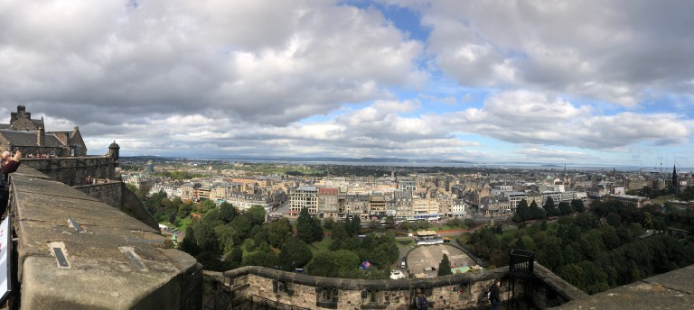 We bought tickets online last night for entrance to the castle around noon. Our hotel is on the newer side of Edinburgh; the walk back up to the castle takes us over the North Bridge with a view out to the North Sea.