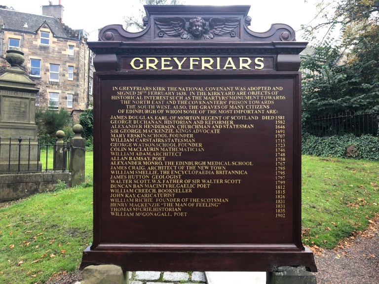 We left the Castle to find Greyfriars Kirk (church) which celebrates its 409th anniversary next year, where is said that some of my wife’s Scottish ancestors rest. We cannot be sure of this, but visited the extensive cemetery and the Kirk. Greyfriars is notable as part of the very real religious battles over Protestantism and Catholicism and the place where the national covenant was signed in 1638.