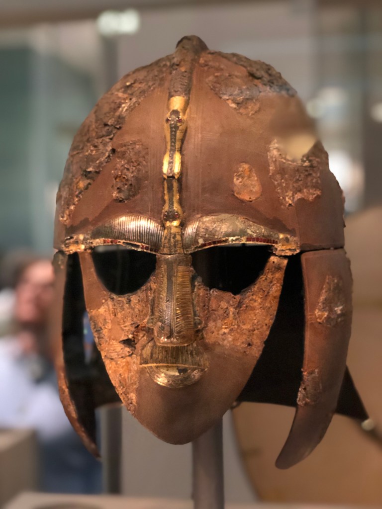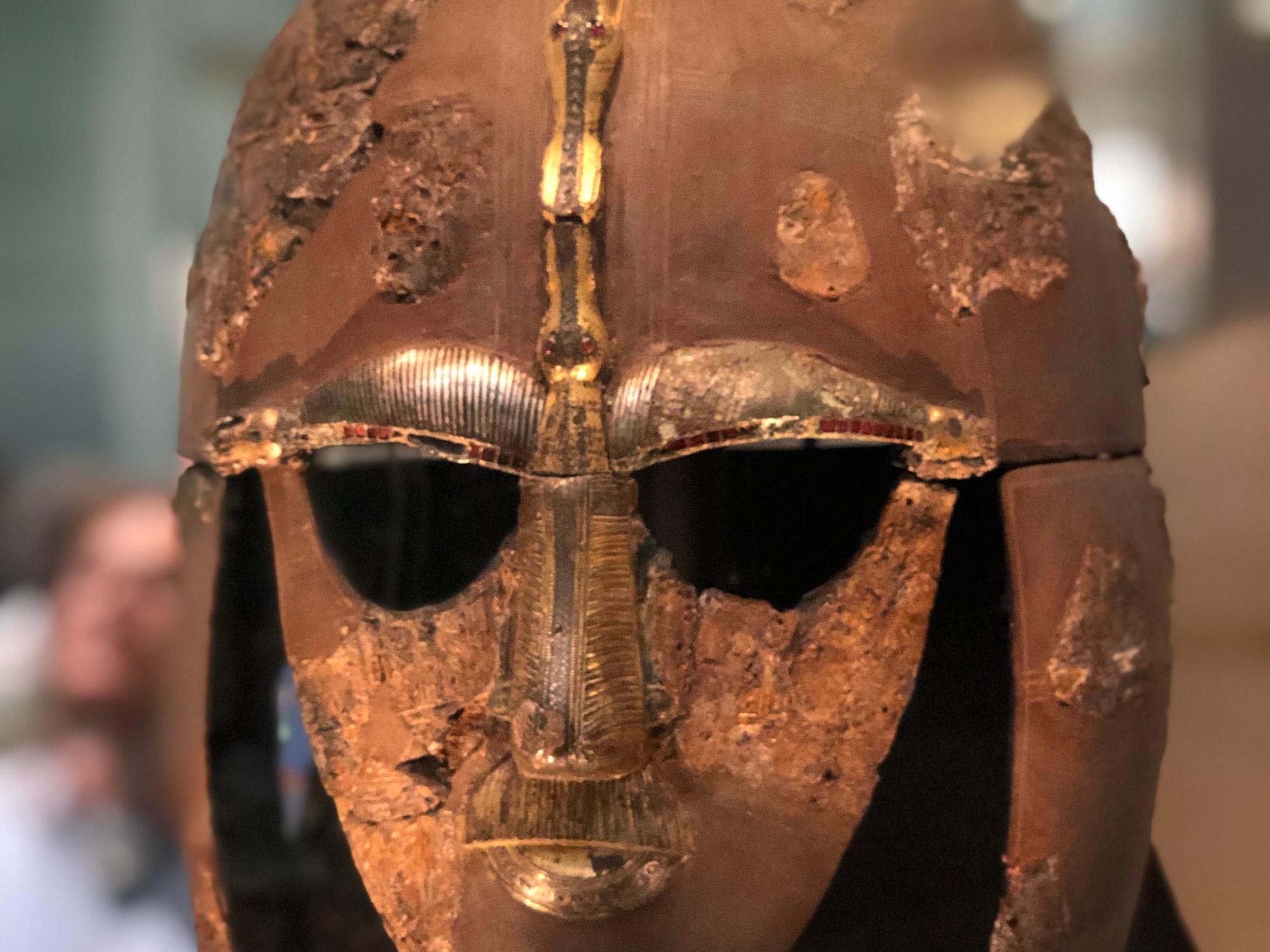This decorated and ornate Anglo-Saxon helmet was found during a 1939 excavation of the Sutton Hoo ship-burial. It was buried around 625 and is widely believed to have belonged to King Rædwald of East Anglia; its elaborate decoration may have given it a secondary function akin to a crown.
