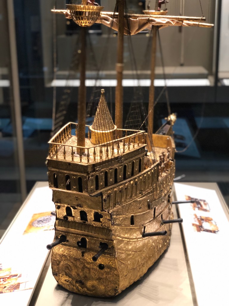 We moved on to a couple of the next rooms, one of which exhibited clocks and how the technology advanced to make them more accurate. Not every clock was designed for high accuracy. This clock, modeled after a ship, would be set on a dining table and moved down the table before firing its canons.