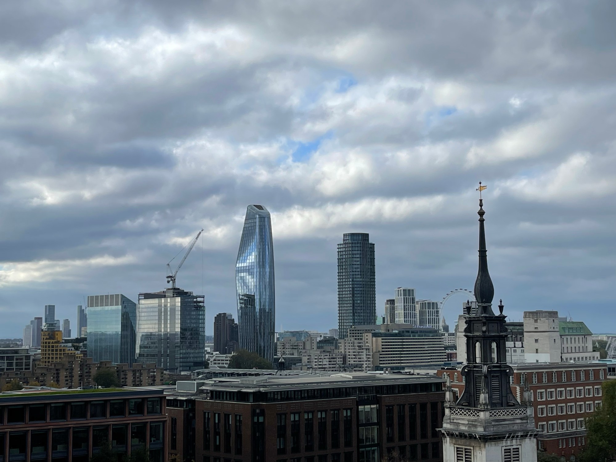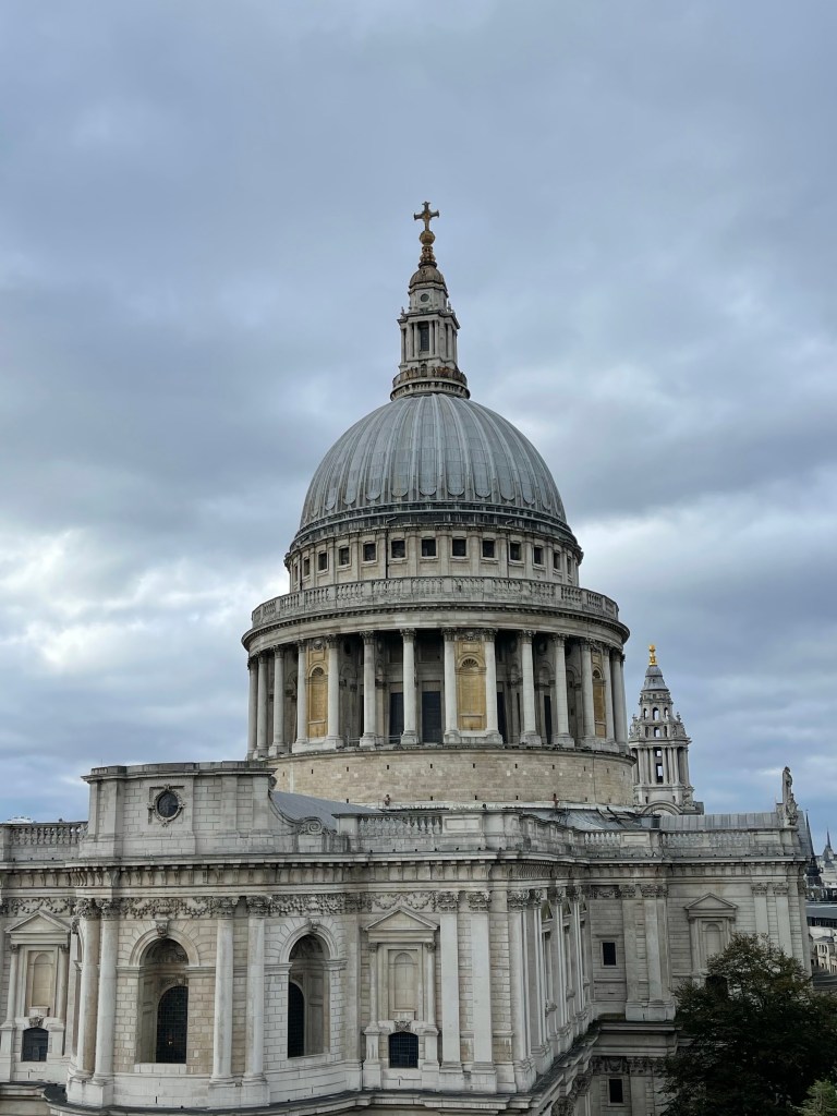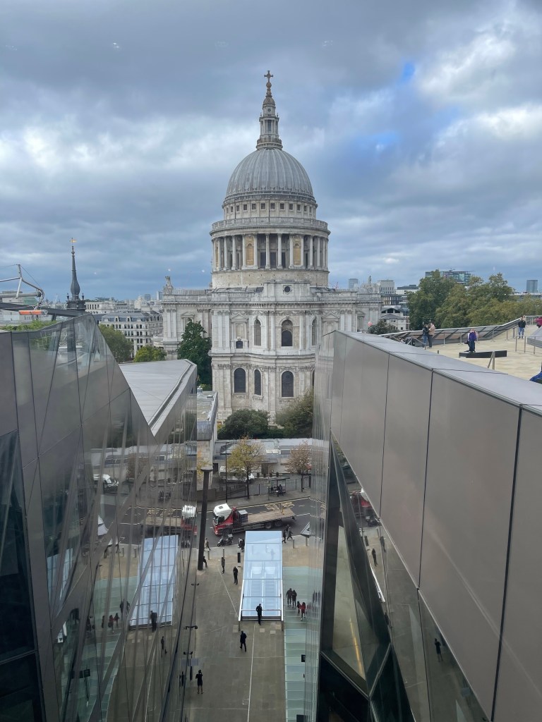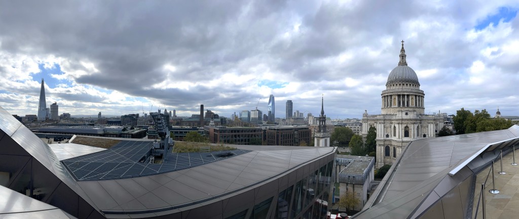 The view of St. Paul’s across from us was taken at the level of the observation deck, so you can see how much taller the cathedral is than the office building. Though it may look cold, it was in the low 60’s, but it was a bit windy. We were there midday and it was free and not crowded, though I imagine on a weekend evening, that would not be the case. The restaurant hostess looked cold and lonely. When One New Change was built, the major construction concern was that it not damage or endanger the relatively shallow foundations of the cathedral. In 1935 an Act of Parliament was passed to control works within a prescribed area, known as St Paul’s Depths, to protect St Paul’s Cathedral from further damage.