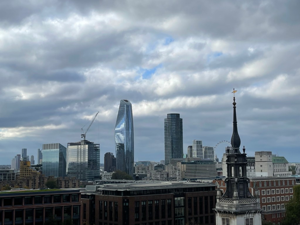 There is a fairly new eleven story office building on Cheapside called One New Change that has an observation deck on the top floor (along with a restaurant and bar). Though it wasn’t the clearest day, we thought we’d still have a good view of parts of the city. We took the Tube to St. Paul’s and One New Change is just a few blocks walk from the Tube stop. It is a mixed use retail/office building with some high end retail on the lower floors and when you take the elevator up to the top, you get a view of it’s neighbor, St. Paul’s Cathedral, which sits imposingly directly across from it. Even though the observation deck is on the eleventh floor, St. Paul’s still towers over you as you look across to the river.