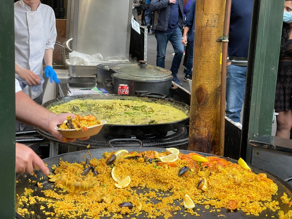 There was a stand preparing huge dishes of pallela next to a fish monger and across from that, a green grocer.