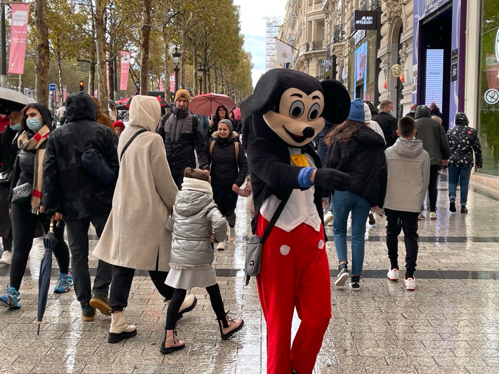 The shops and sidewalks along the Champs Elysee are busy as ever, even in the weather, with waiting lines outside some (crowd controls). Even Mickey was out and about. Who let the mouse out?