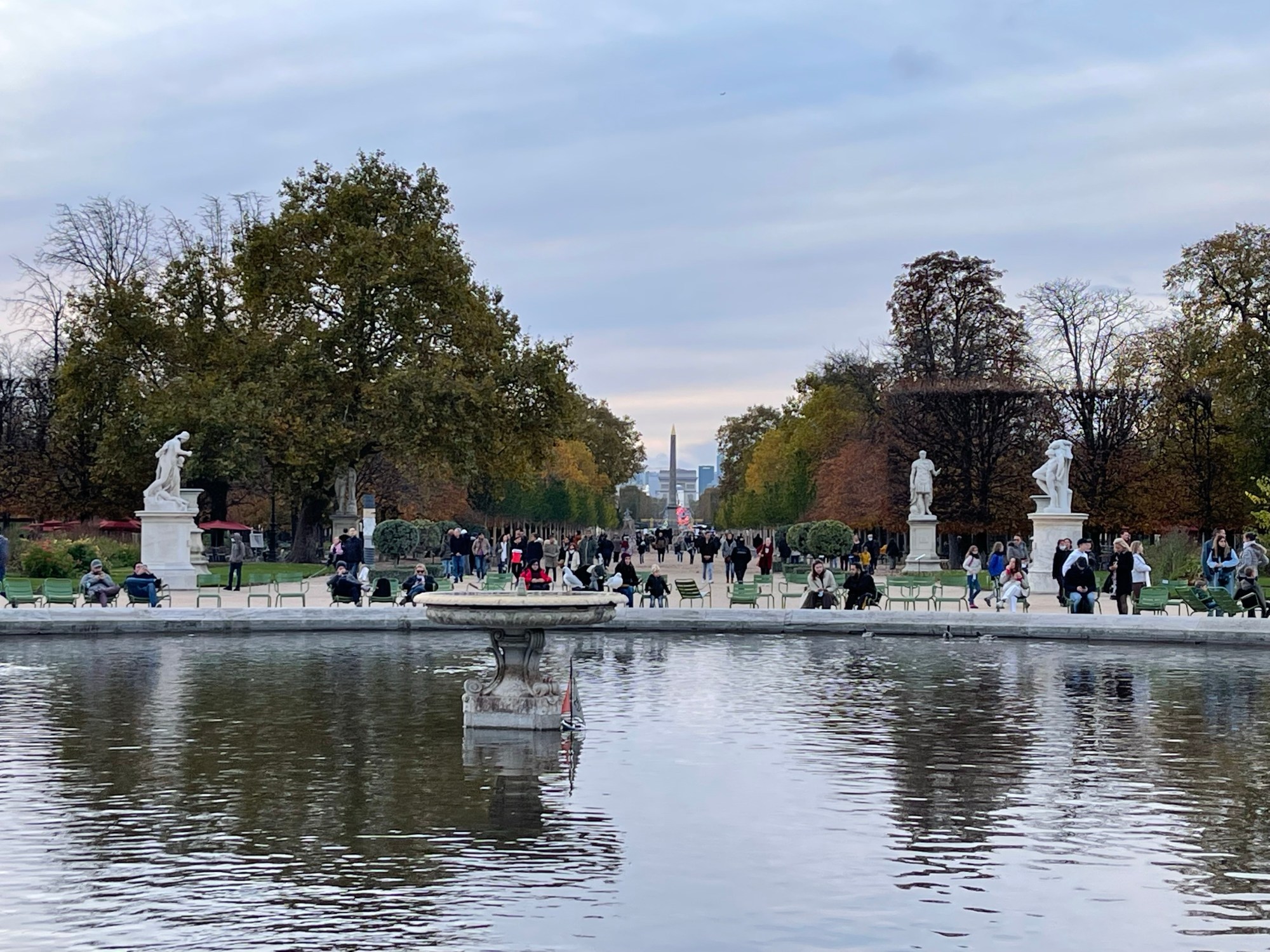 It was getting late in the afternoon but I wanted to go into the Tuileries. We were at the end near the Carrousel du Louvre and the Louvre itself. Still busy, there are two large water ponds where people lounge in the reclining green chairs, taking a nap, talking with friends, playing cards or, for children, sailing boats.