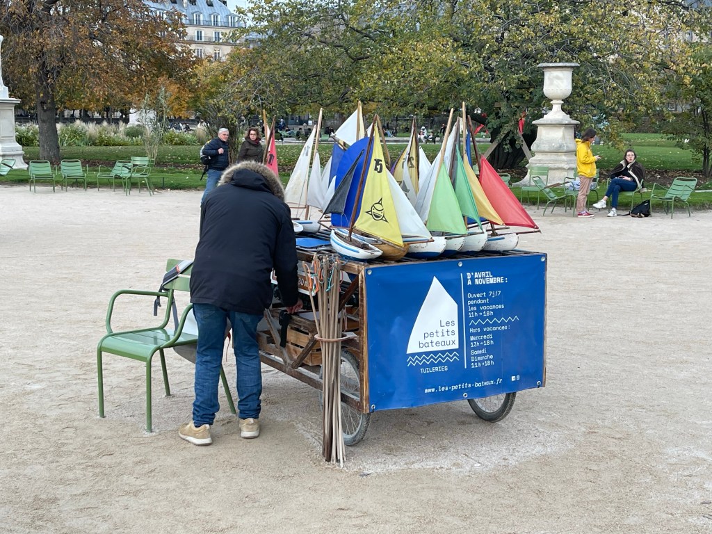 As we walked back towards the Tuileries, we walked down a side street and noticed how many different modes of transportation are being “experimented” with here. There have been electric cars and bicycles for rent here for many years, but there are more still, as well as car and motorbike and electric scooters share services. Since we were here just two years ago, we see a noticeable difference on some major streets with fewer car traffic lanes and dedicated lanes for scooters and bicycles. Though there have been electric scooters for some time (just as in other major cities), they’ve obviously tightened up where these vehicles can be ridden (dedicated lanes) and where they are to be parked – you don’t see them parked or thrown down randomly at street corners or ridden on sidewalks. Many more bicycles than we’ve ever seen (though nothing like Amsterdam where bicycles outnumber people).