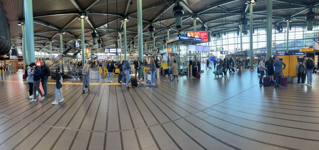 Unsurprisingly, Schiphol Airport (world’s 3rd busiest airport by passenger totals) has changed since we flew in here >3 decades ago! Shopping has always been a strong point for the airport. While we didn’t stop to shop, (another pin on the map for the HWT 😉) the abundance of shops and restaurants puts most other international airports to shame. We waited in line for immigration clearance for almost an hour. For most of this time, they had one (!) agent servicing non-EU arrivals, which was most of them and unlike the UK, no e-gates where you can breeze thru. Unlike the American airports, Schiphol requires wearing face masks.