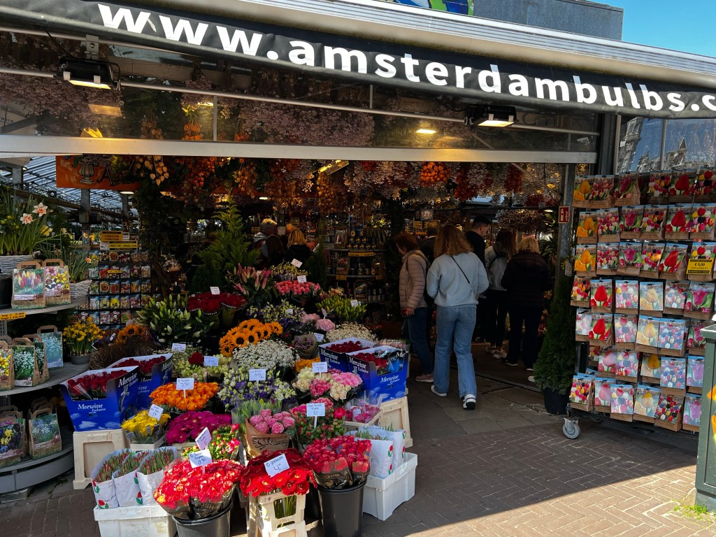 We could not check into our hotel room (Invictus Games are going on in The Hague and the hotel is full) , so we checked our bags and ventured out to find something to eat and see the flower market (Bloemenmarkt) , a floating flower market. In a city with soooo many tourists, I’m sure the hotels were devastated by the pandemic and the reception at the hotel was obviously very happy to see returning guests. We took 2 trams and it only took a few minutes to get there. Crossing a street in Amsterdam, you’re not really concerned about auto traffic, but bicyclists are the pedestrian hazard (and we to them), coming silently down the bike paths on each side of the street and Trams on each side of the street. You really have to look out for cyclists.