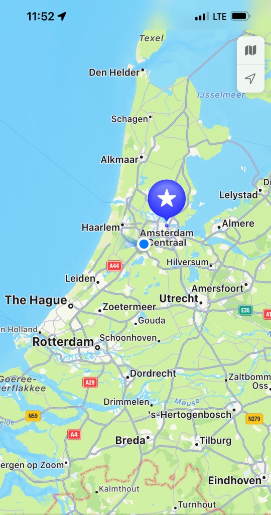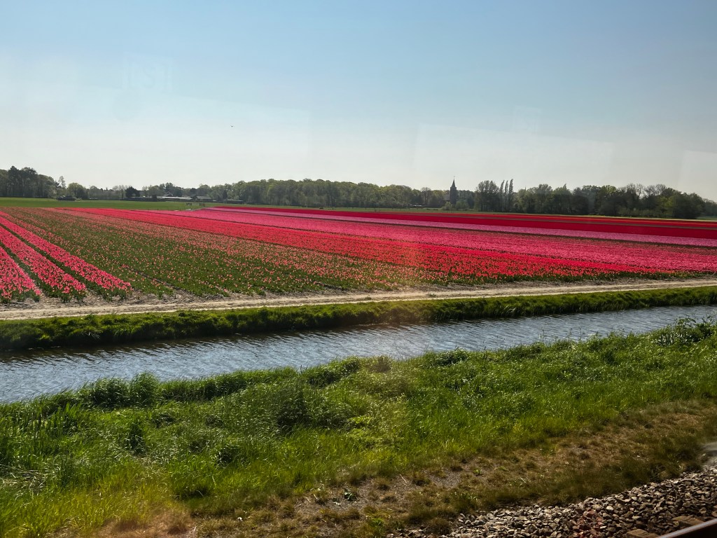 We bought round trip same day tickets to The Hague in Amsterdam Centraal from the ticket machine (~$58 for two) and found our Spoor (track). The route to Den Haag from Amsterdam stops in Schiphol airport, where we change trains, then stopping again briefly in Leiden before continuing on. The landscape outside the cities is very flat, as you’d expect from what is essentially reclaimed ocean. Using the Compass app on my phone, I could see that the elevation ranged between 40’ above sea level to 40’ below sea level (most of the time it was about ~10’ above sea level) . There were quite a few small water channels cutting through the farmland, allowing the (rain) water to drain off. These channels were not wide enough for a boat to navigate, though we saw a few that were navigable. We only saw one windmill (trees along the track obscured the view, so no photo) as well as wind turbines (we’re close to the ocean, so wind power) and a large solar array. We passed a few fields of tulips, a sea of red or yellow. On the outskirts of the larger cities it was common to see allotments, small allocations of gardening space where city dwellers come to garden, each one having a small greenhouse or shed. The trains run often and have Wi-Fi. There are few people on the train wearing face masks. We wear the masks on the Metro and trams, but haven’t been wearing them here.