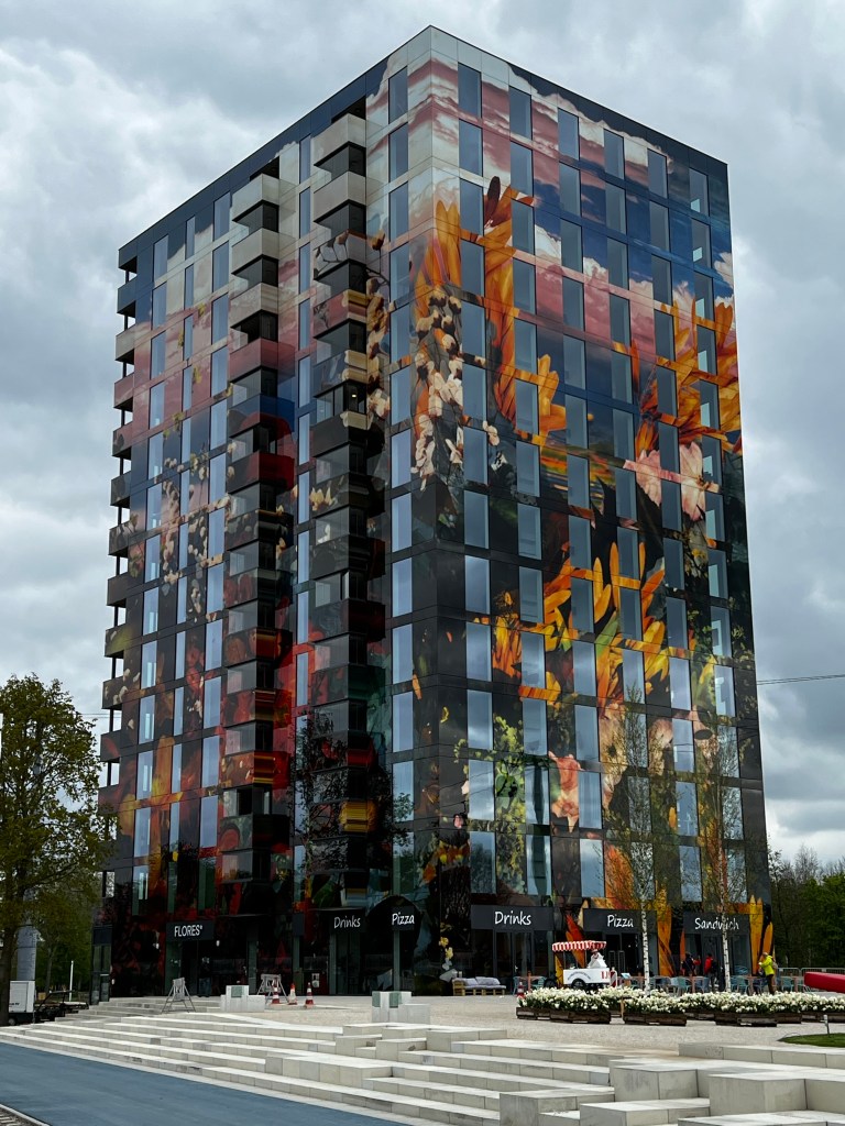 The park and exhibits are large and it’s wise to plan out your exploration to allow you to see what you want without backtracking. The main entrance has a wide boulevard planted on one side with alternating mass plantings of different colors of tulips. Floriade wasn’t intended to compete with Keukenhof on tulips, but they were very nice. On the several sides of the main boulevard, there are some multistory buildings, which we surmise will end up as residential once Floriade ends.