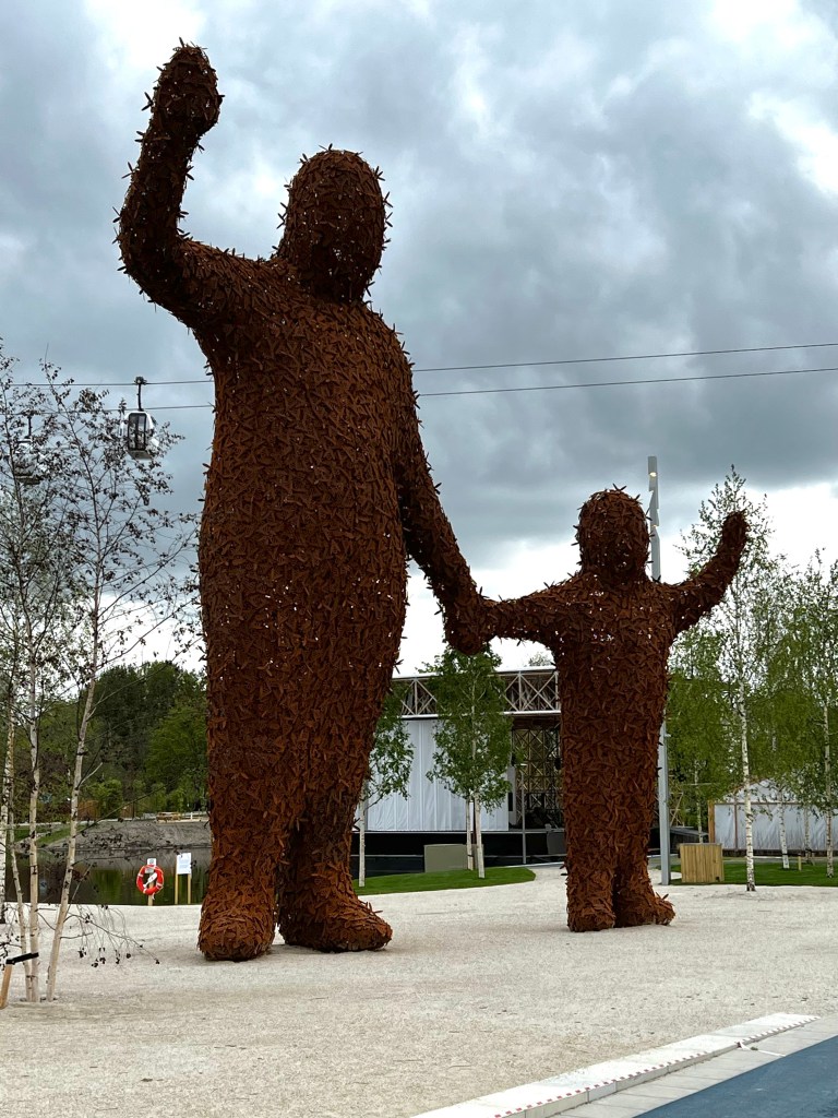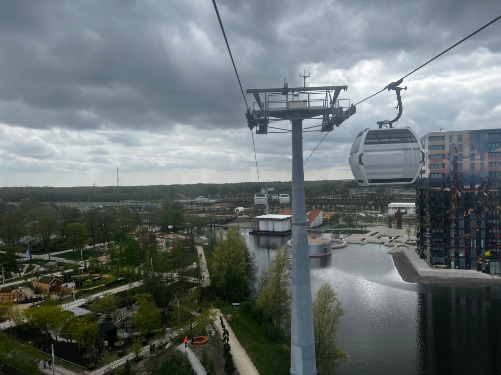 Entrance into Floriade was just getting started (we got there an hour after it opened), so no backups there. Floriade is spread out over several islands on this part of the lake, interconnected by bridges and an aerial lift system that transports you from one side of the park, over an intervening motorway, to the other. Your ticket gives you one trip, one way, so we had to decide later on which end we wanted to end up at to take our ride.