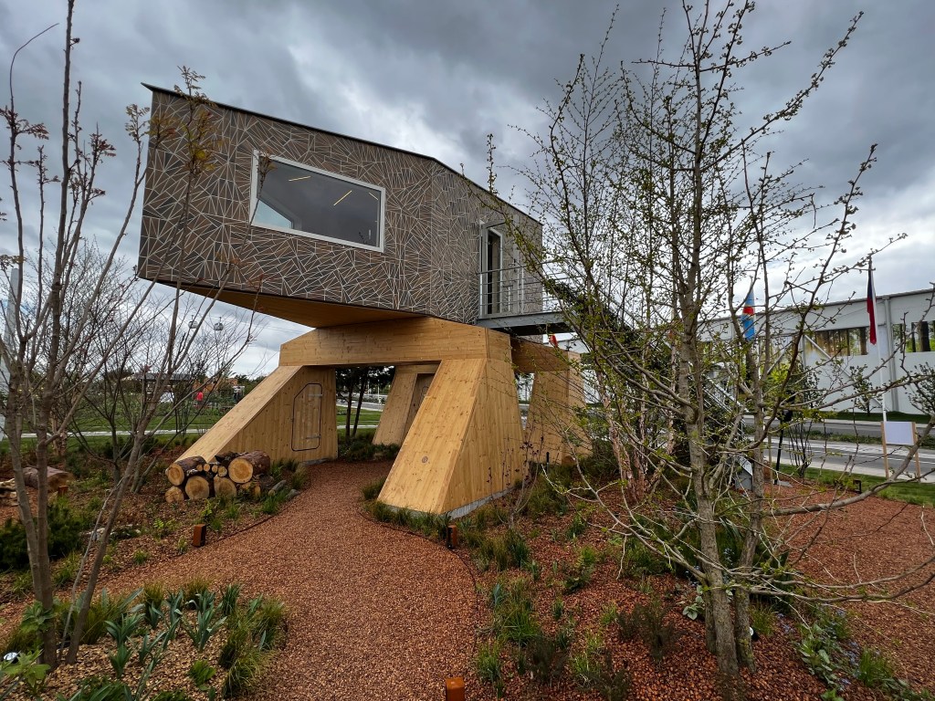 These buildings and tiny homes (see below) are intended to be illustrations of design concepts and use of natural and sustainable materials. Everywhere in the park we saw the focus on alternative and imaginative uses of materials for developing green spaces. They had a display that used old navigation buoys and were converted to be planters for trees, big freight containers you’d see carrying freight from overseas being used for other things.