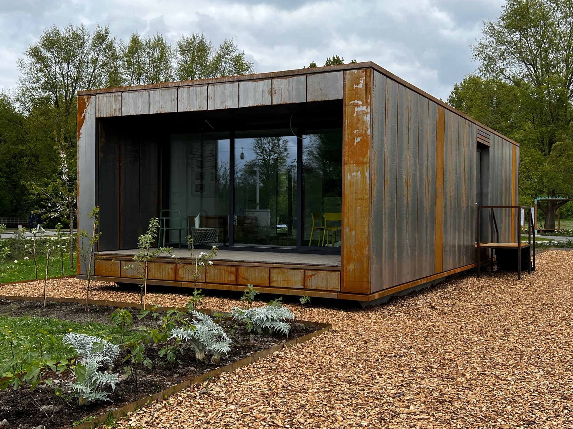 These buildings and tiny homes (see below) are intended to be illustrations of design concepts and use of natural and sustainable materials. Everywhere in the park we saw the focus on alternative and imaginative uses of materials for developing green spaces. They had a display that used old navigation buoys and were converted to be planters for trees, big freight containers you’d see carrying freight from overseas being used for other things.