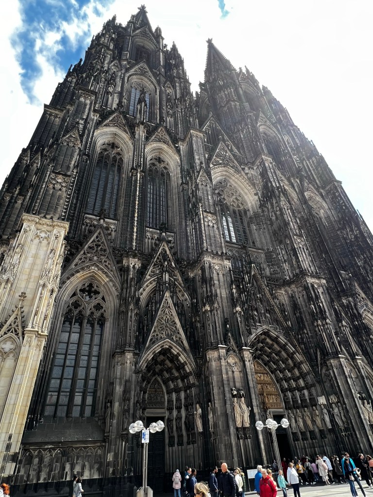 It’s been decades since we did a whistle stop visit to Cologne (Köln) and I can still remember the awe with which I regarded the cathedral (Hohe Domkirche St. Petrus) as we exited the train station. Köln is only about 30 minutes by train from Düsseldorf. The train station is vastly different, but the cathedral, which began construction in 1248 but halted in the years around 1560, is hugely imposing. Work did not restart until the 1840s, and the edifice was completed to its original Medieval plan in 1880. Like many other churches, this one has had many incarnations and reincarnations over its >770 year history, shepherded by different architects and surviving wars, religious and political battles. The second church built on this site in 818 was destroyed by fire in 1248. When people look at a structure like this, seldom do they appreciate that it took hundreds of years to be completed as events like wars interrupt and finances weigh. Construction was completed in 1880, 632 years after construction began. It was the tallest building in the world for four years, it’s twin spires reaching for heaven.