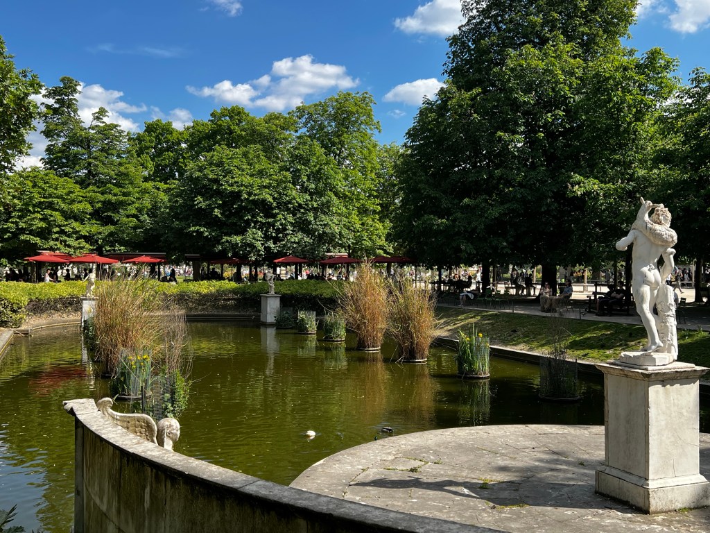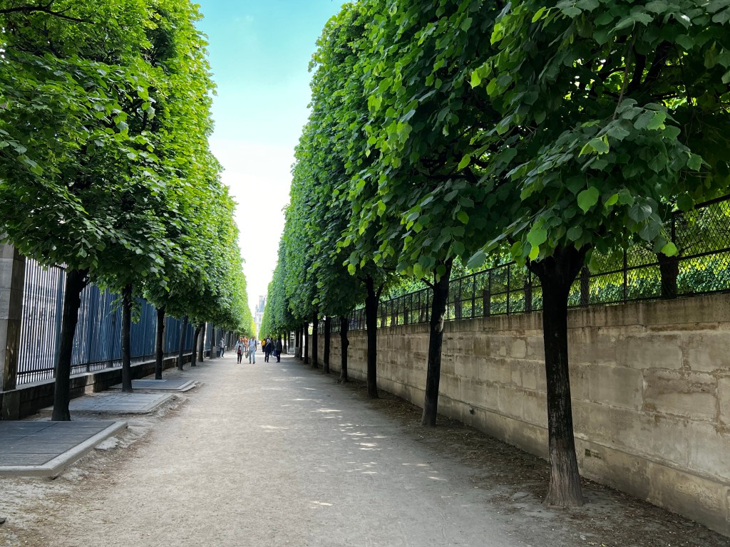 Up the stairs and to the right are rows of poplar trees cut into symmetrical box shapes and, on this sunny day, a nice shady spot. Not far off to the right is an overlook to the main entrance to the gardens from Place de La Concorde and in the distance, Eiffel Tower.