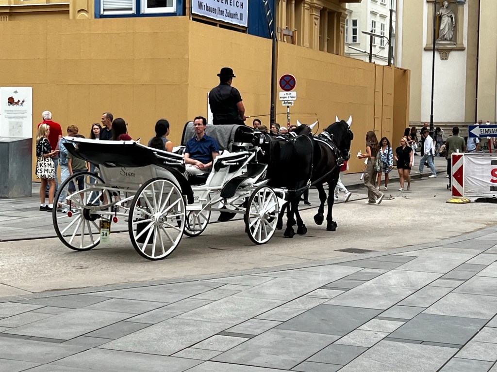 There is a long queue of horse drawn carriages awaiting passengers lined up on one end of the Hofburg and we see them making their way through the old quarter.