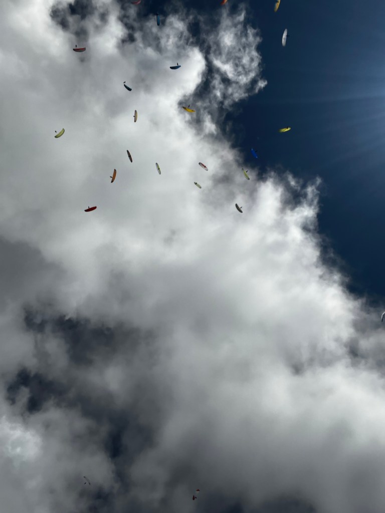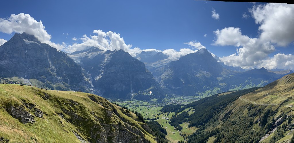 Off to the left of the platform is the outside dining area for the restaurant (we had lunch) and down below is where they’re launching paragliders. There are literally dozens of them and we think we spot the color of the chute of the guy who came up with us. After a while, it’s like an aerial ballet (video) with so many gracefully making turns and at times, coming directly over us, waving. At times, they are clustered together, but after some time they are spread out across the valley in front of us as well as in the mountains behind us. Compared to Lauterbrunnen, I have to think it’s safer (considering you’re jumping off the side of a mountain) to sail here as the cliff walls in that valley are much more steep.