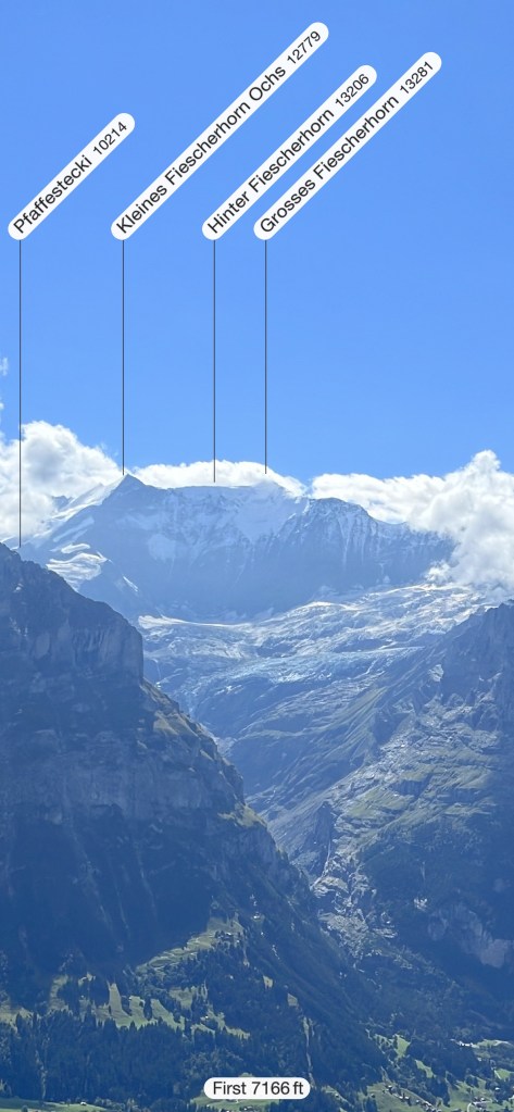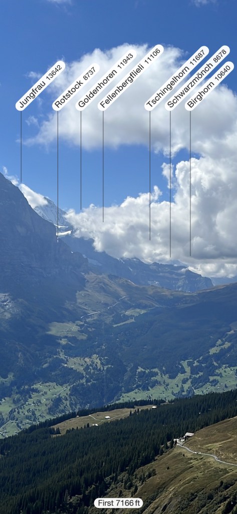 We hoped the weather today would be good because we wanted to go up to Grindelwald First Cliff Walk. As I’ve mentioned before, weather in the mountains is extremely variable and it could be nice in the morning and cloud up or rain later. Fortunately, it’s a beautiful day here and this was the single thing we’d hoped to do in the way of an activity here. There are several activities up here, the Cliff Walk is free; the other activities cost. (Grindelwald First is sponsored by Tissot) , the only thing you pay for is the cable car up.