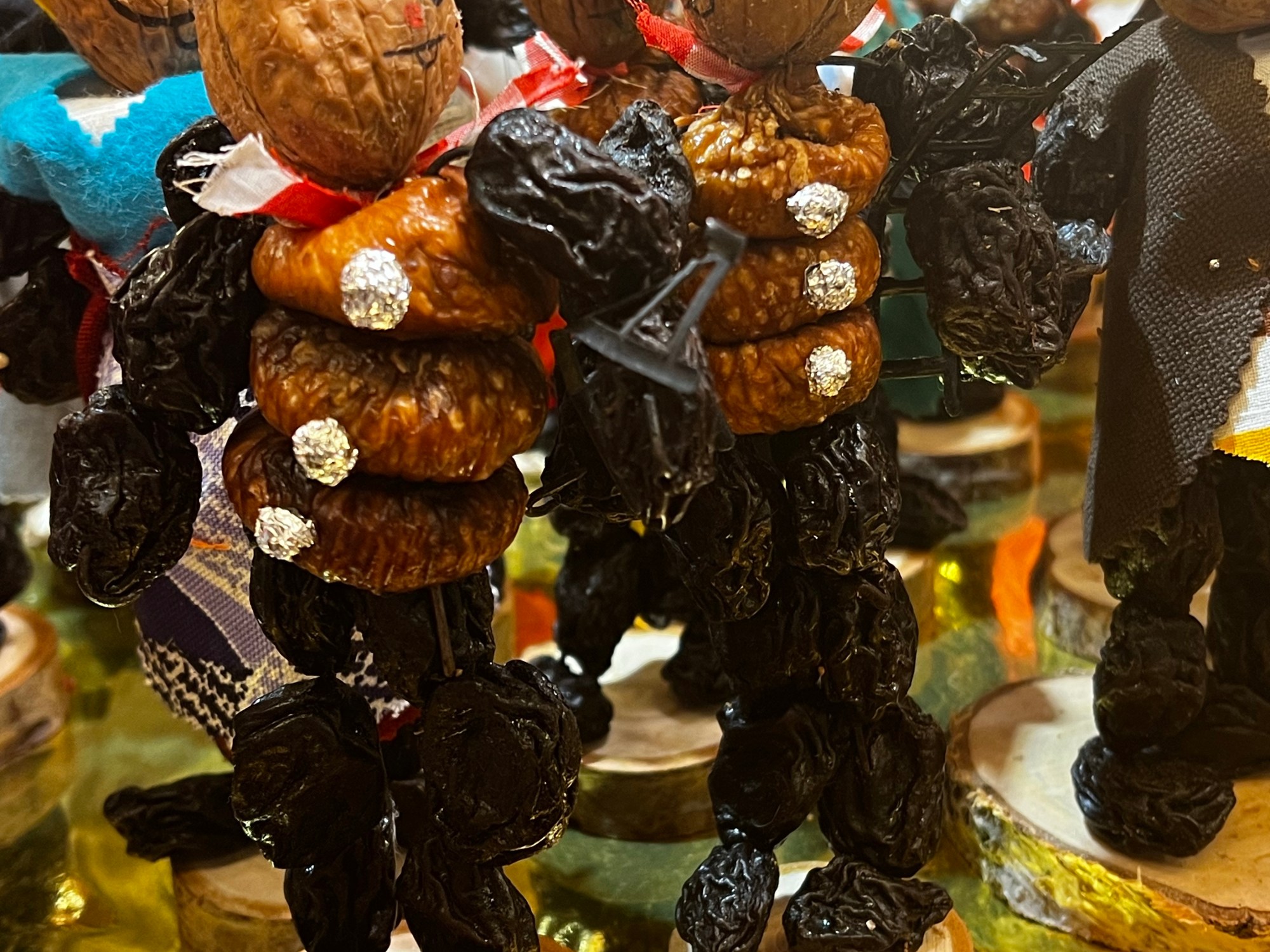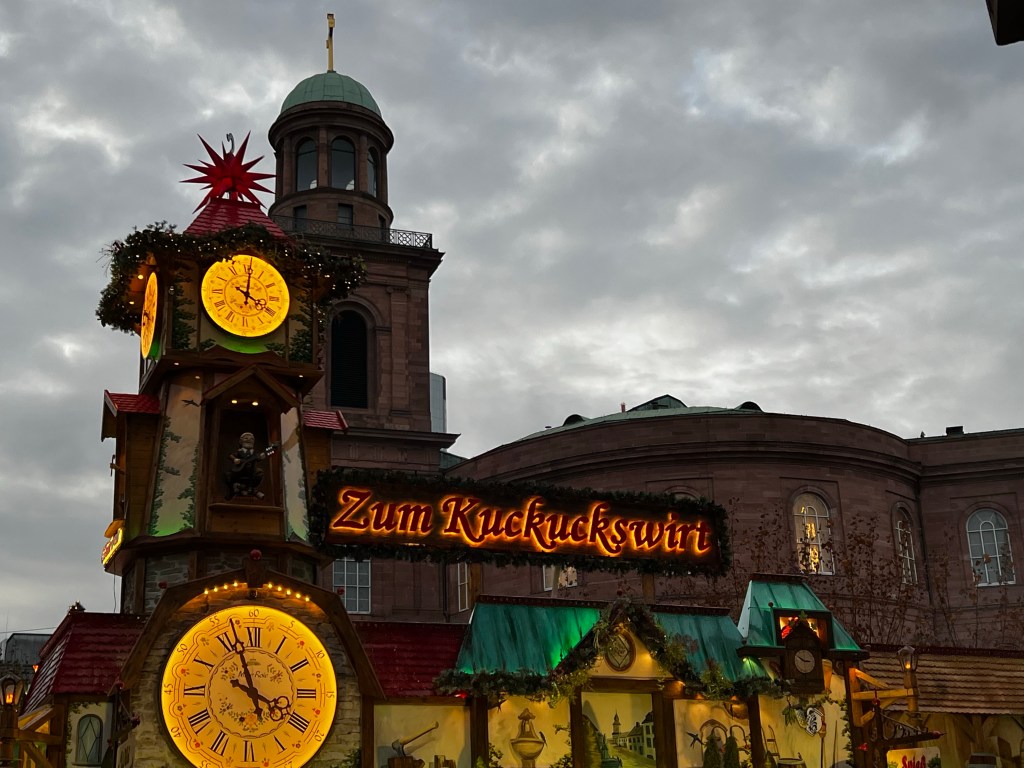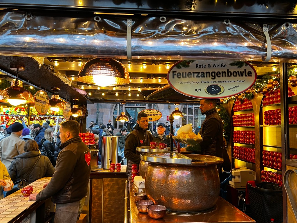 After resting up a bit, time to go find the Weihnachtsmärkte, why we came! There are several, all in the same central square about a 10 minute walk from our hotel. At 4pm, it’s crowded, but as the evening wears on, it’s just shoulder to shoulder. There’s a central Christmas tree (not yet lit when we arrive), stall after stall selling food and drink. Not as many stalls selling ornaments, etc as we’ve seen in Nuremberg (our next stop), although there’s a Käthe Wolfhart (famous for Christmas ornaments; we visited many years ago in Rothenberg ob der Tauber); tonight the line to get in is just too long.