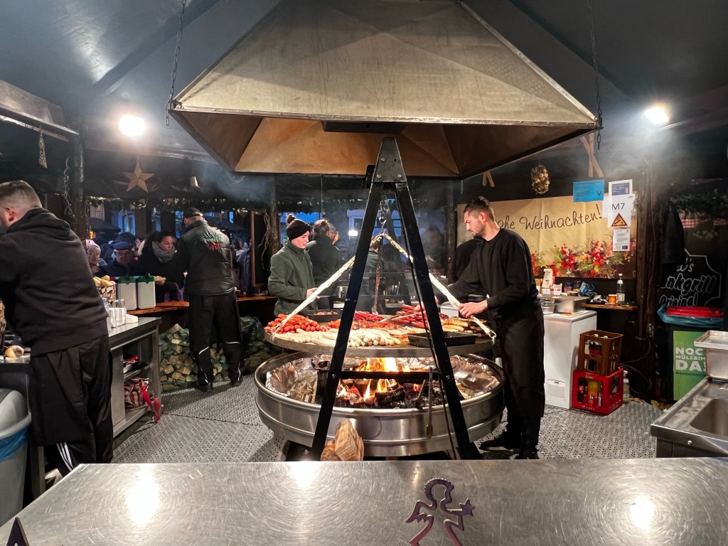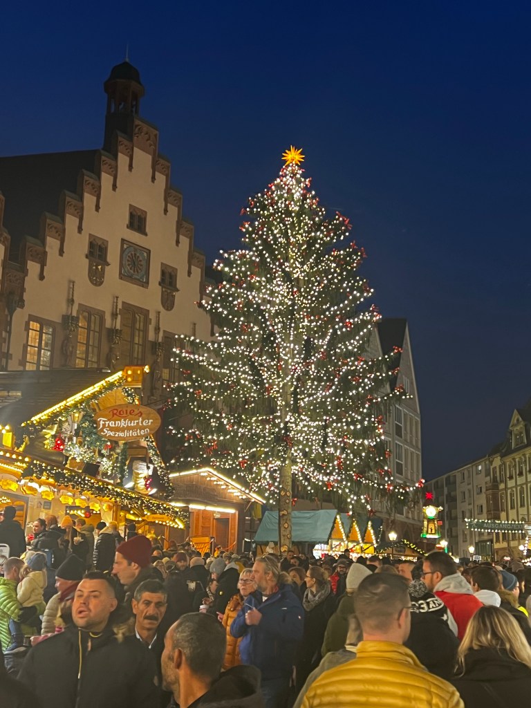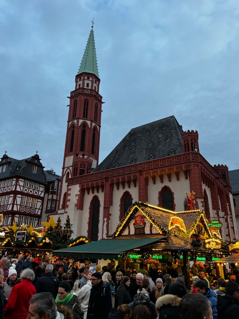 It was still daylight when we arrived about 4, but by 5pm, it’s dark. We wandered through the the Römerberg (Its origins date back to 1393) – Frankfurt’s famous old town centre, down to the Main river and back, stopping to have bratwurst, kartoffelpuffen (potato pancakes with apfelsauce) , a gluhwein, and a Feuerzangenbowle (how could you pass up something with that name?). These cost in the range of 5-7€ each.