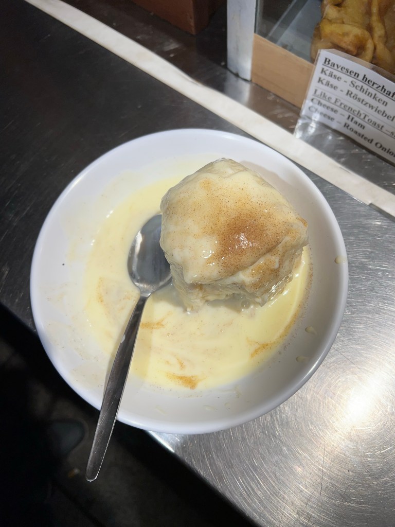 Looking down towards Karlspkatz from here (about 2/3 of a mile) it’s just a continuous array of more stands. For the relatively small parts of the market we’ve seen tonight, there are relatively more food stands in the main square. We had a Dampfnudel, a yeast dumpling topped with vanilla sauce. It’s something we saw others eating and looked around until we found it. It’s light, but heavy as you might think a dumpling would be.