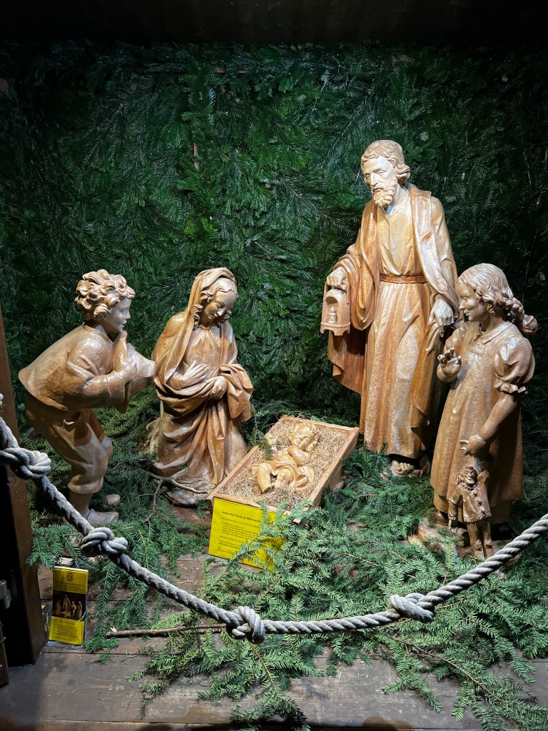 On one of the side streets, there’s a small Christmas market of its own that specializes in hand carved Christmas figures and nativity scenes (Krippenmarkt “krippen” = crib) . At least one of the stands has works from a small city we’ve visited years ago called Oberammergau (also the site of the famed Passion Play or Passionsspiele).