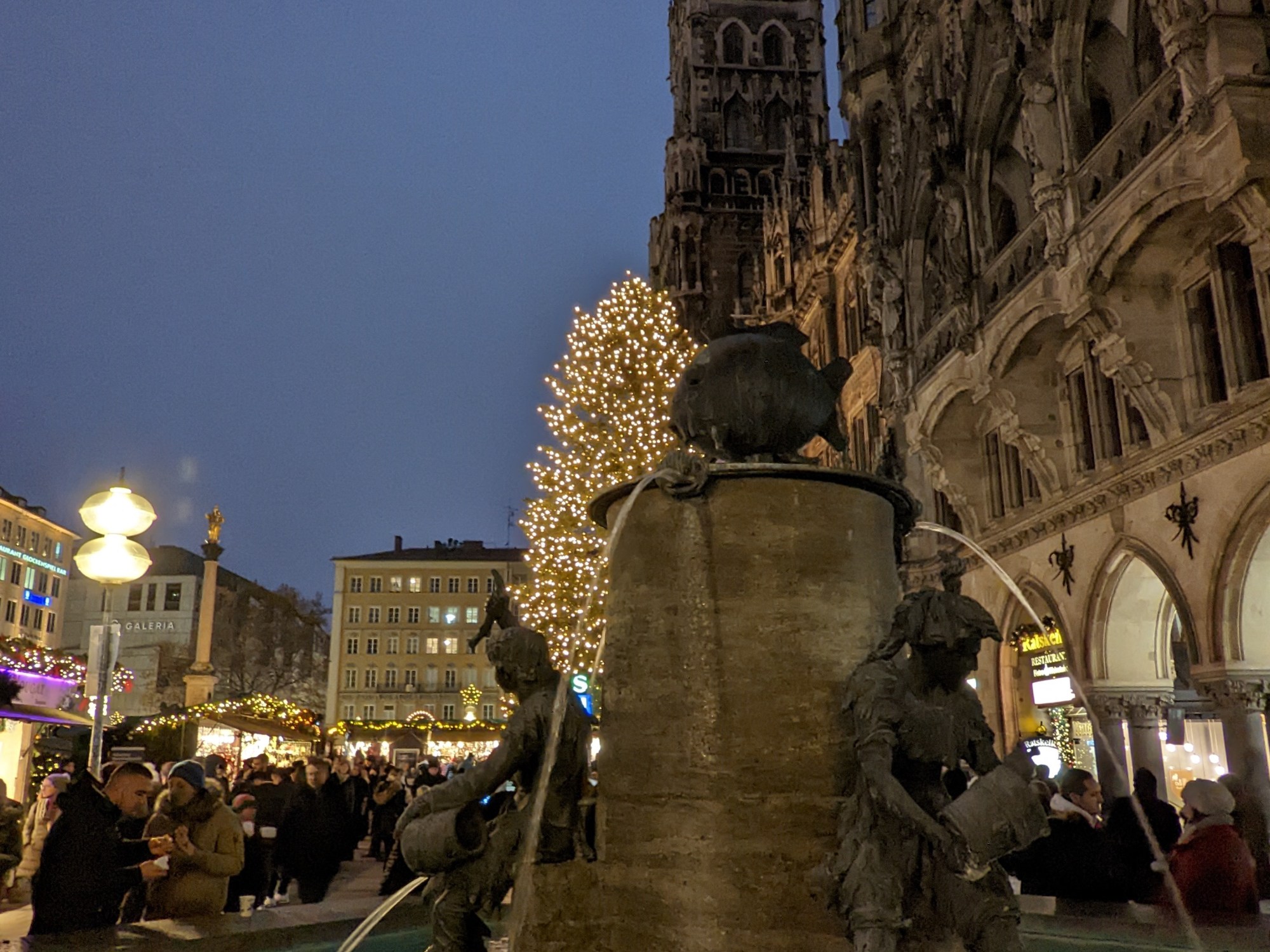 Further down Ludwigstrasse we pass Alois Dallmayr, a luxury food purveyor. It’s Sunday, so the store is closed, but they have some animated window displays. We entered the Marienplatz from the side to see it all lit up with a large Christmas tree in front of the Neues Rathaus with stands spread out across the entire square as well as down the side streets on both sides.