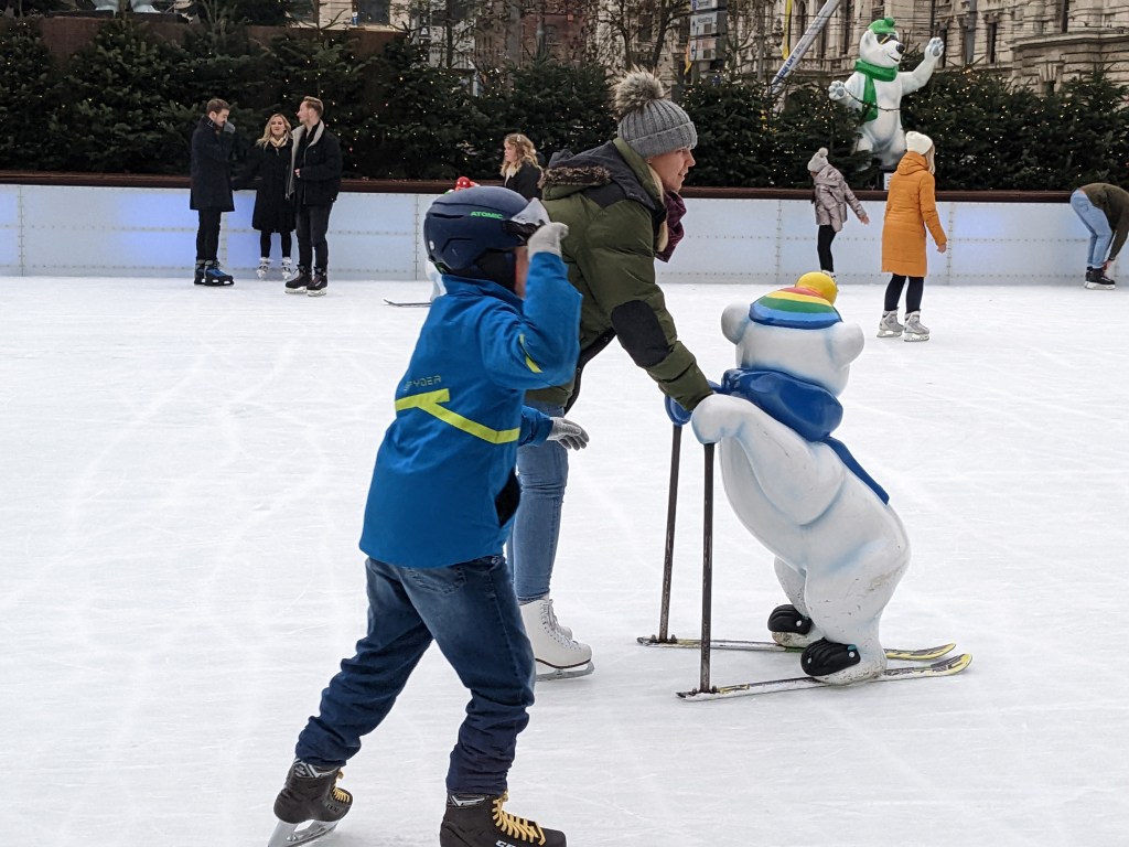 Taking the UBahn brought us to Karlsplatz , a public square just before the Tor (ancient city gate) that’s the start of the Marienplatz. But instead of the large fountain we’d see here in the summer, there was an ice skating rink and a restaurant. Rather amazing considering this was all erected in the last few months and is temporary.