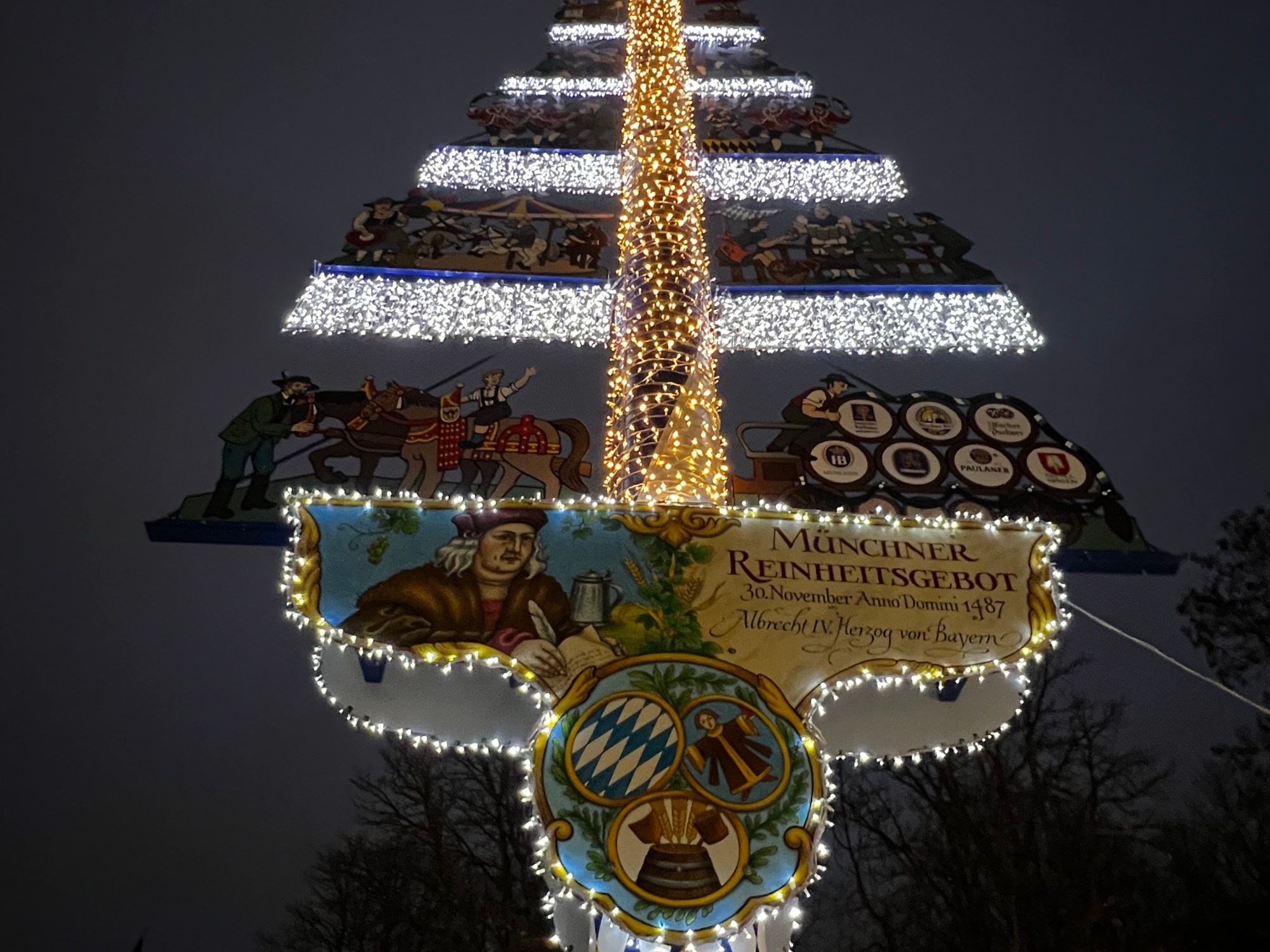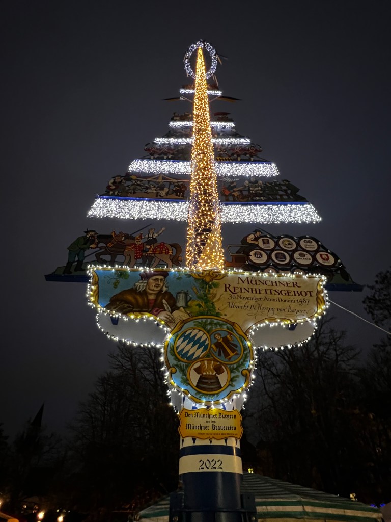We’d understood they had a Christmas market, but it wasn’t so much that as the food stands that are open had decorated with lights and the Maypole was lit to the tip. Though it wasn’t that late, only a small portion of the food stands remained open.