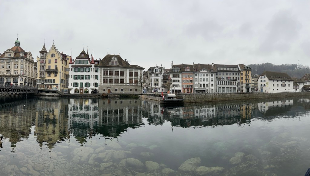 The water level of the river is very low, we’ve seen it at least six feet higher. The Reuss River comes out of Lake Luzern, which is fed by snow and glacier melt.