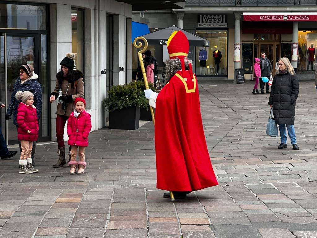 We had just started enjoying a gluhwein when we heard the clanking of bells and rushed to the market entrance to see a procession passing by. It was Samichlaus , Santa (YouTube video). Tradition has it that Samichlaus (YouTube video) is accompanied by Trychler and Scheller (cow & other bell bearers), and always accompanied by his donkey (there was actually a donkey), Samichlaus walks through the lined streets. Samichlaus was moving at a pretty good pace and his bell bearers were clanking their bells loudly. It was a bit of a challenge to catch up to them as they wended their way from one side of the river to the other (old town).
