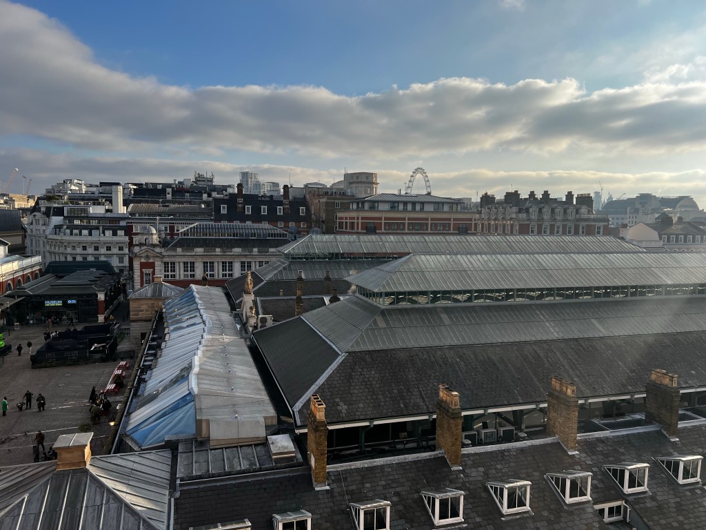 Our first stop today is the rooftop terrace at the Royal Opera House, at Covent Garden. This was already on the plans for the week, though not necessarily for today, but it was not far away from our second stop (see further below), so it made sense to do this today. There is a shop for the ROH and cafe on the ground floor and up one flight of stairs is an escalator to take you up to the rooftop terrace that runs around two sides of the building, overlooking Covent Garden.