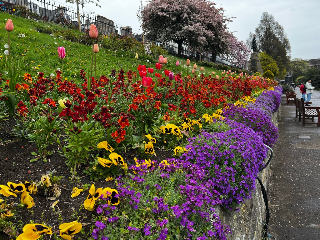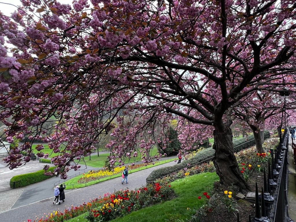 Entering the city, we’re flanked on both sides by mostly older four-five story flats with retail on the ground floor. We exited the tram at Princes Street, which is a main thoroughfare, with gardens down below street level. We’ll visit the gardens later I’m sure, but the cherry trees are in full bloom and we see tulips down below.
