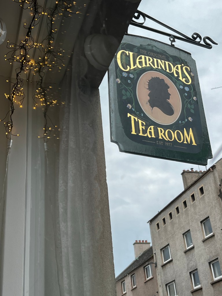 The Royal Mile leads us to our last destination today, a small (8 tables) tea room called Clarinda’s Tea Room. It’s quite a walk down the Royal Mile. Cutting up into the “Mile” from below , to the right would lead us to Edinburgh Castle, and at the other end is Holyrood Palace.