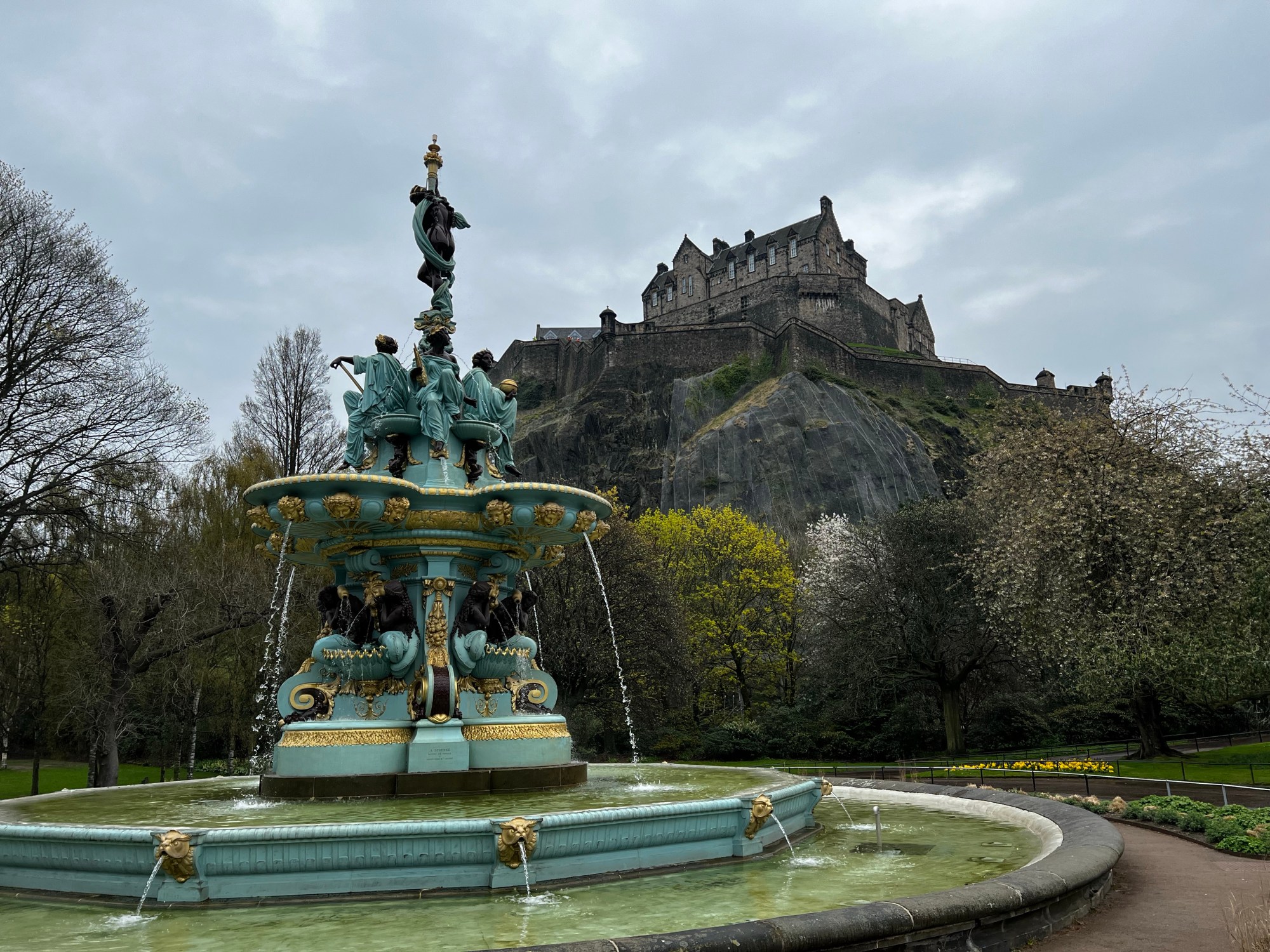 Entering the city, we’re flanked on both sides by mostly older four-five story flats with retail on the ground floor. We exited the tram at Princes Street, which is a main thoroughfare, with gardens down below street level. We’ll visit the gardens later I’m sure, but the cherry trees are in full bloom and we see tulips down below.
