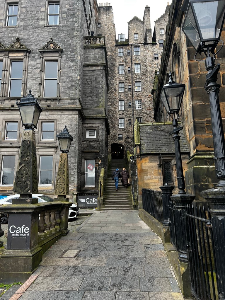 We thought we’d visit the Grassmarket today (Saturday), but surprisingly, it doesn’t stay open late (5pm) , so we decided to go to Victoria Street and the area around the Royal Mile. To get to the Victoria Street, you need to go up “The Mound”. To me, the “Mound” is a bit of a misnomer , it is the (artificial ) high elevation on which this section of old Edinburgh is built, using 1.5m cartloads of earth from the “New Town” and then dumped into Nor Loch (now Princes Garden). After taking the winding walkway up the road that overlooks part of Princes Garden, it comes up to a point where you can either follow the road around to left or right, or go up the stairs.