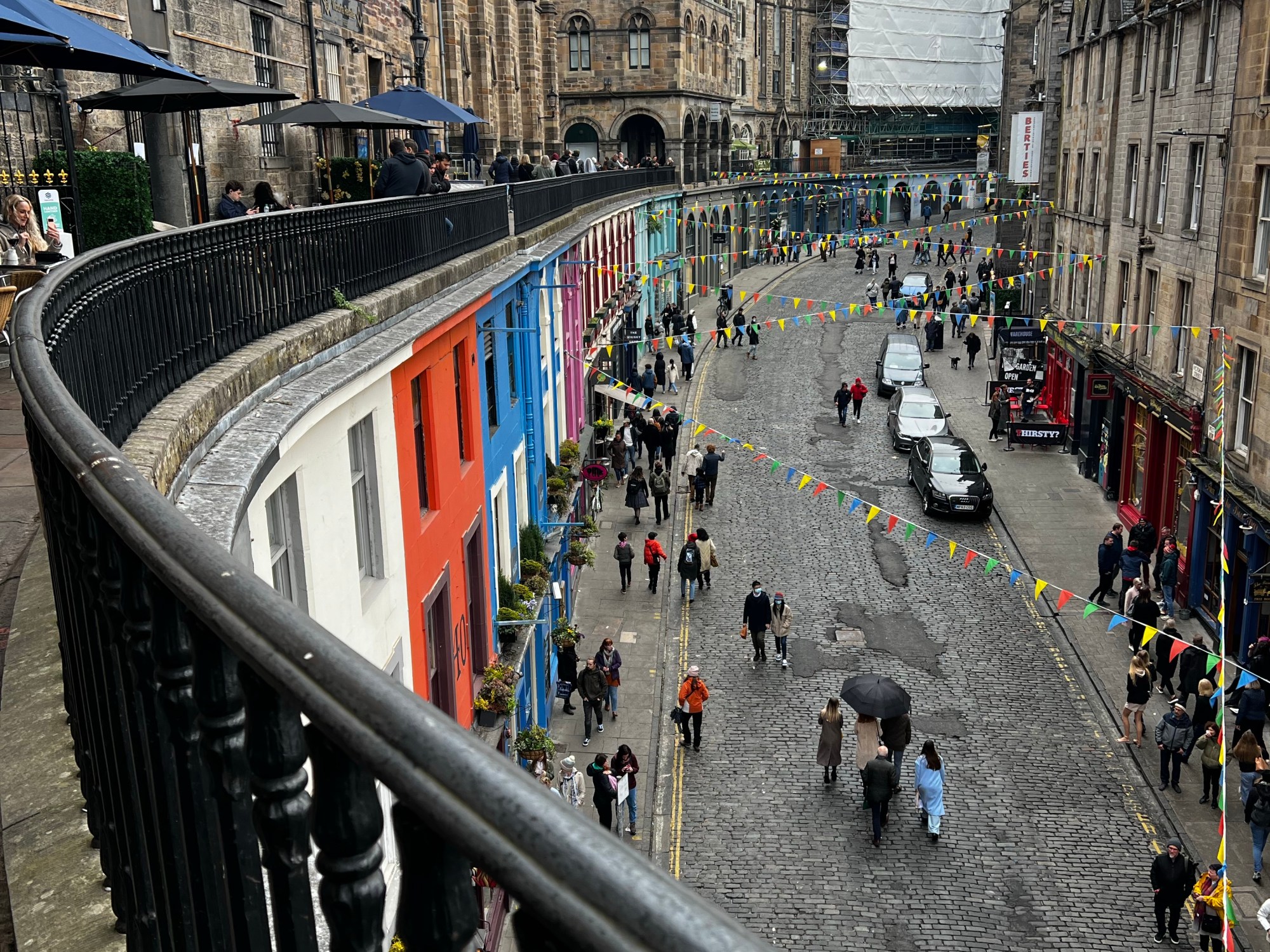 Once climbing this initial set of steps, ( The last time we were here we exercised better judgement and went up the street instead of the stairs.) there’s another shorter set…until you walk a bit further and emerge on the Royal Mile, cross over the street and down a short street to be on the upper level of Victoria Street. The link provides some nice historical context to the area.