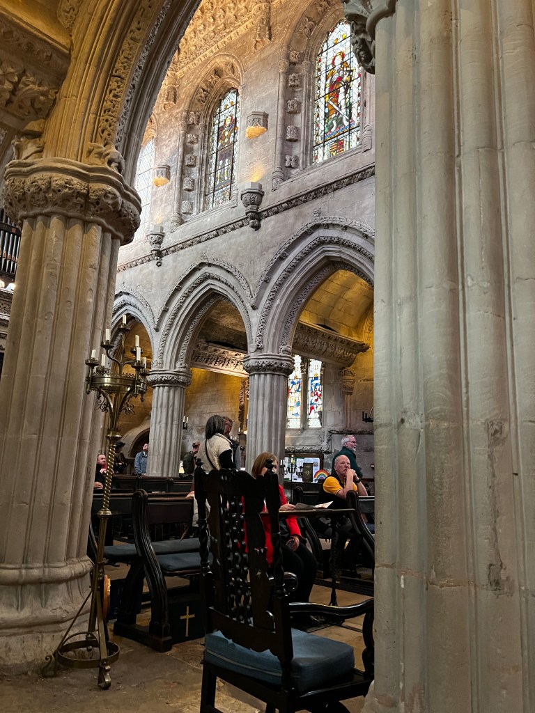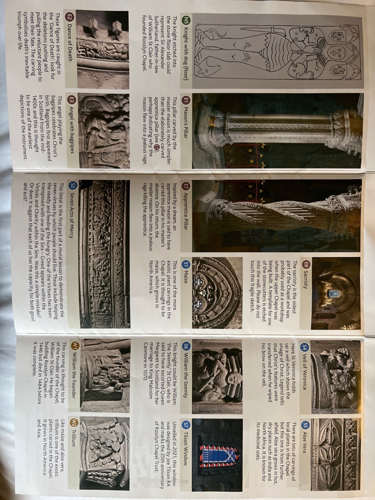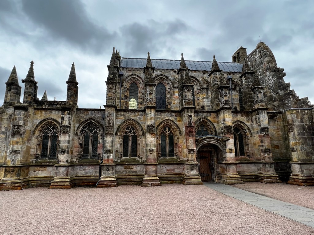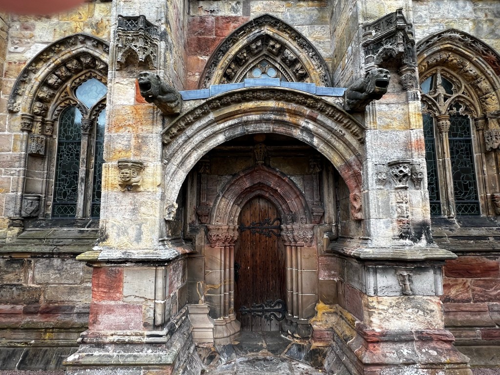 A bank holiday today meant a number of the shops were closed, but we had plans to travel out to see Rosslyn Chapel, a 577 year old chapel about 7 miles outside Edinburgh. We took a Lothian (regional) bus from Princes Street. Although only 7 miles, because it stops.at.every.bus.stop it takes almost an hour. We purchased online tickets for the Chapel for today, the previous evening , as it’s a major attraction in the area. There were three tour buses there by the time we left. Due to the inclusion of the Chapel as background for scenes in the DaVinci Code and the Knights Templar , pre-Covid, there were 200,000 visitors a year, so it’s a very popular place.