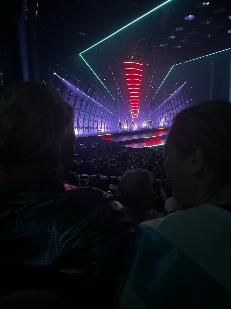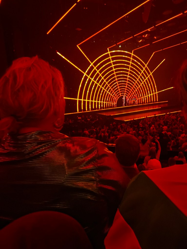 ABBA appear standing together maybe 50’ or so from the Dance Floor barricade , so I doubt even those at the front of the barricade could see the individuals more clearly than we could (we had good seats higher up -no “Dance Floor” for us) and the performance is shown on large screens in front and to each side of the stage. A 65 meter tall (214’) screen wraps around most of the venue. It’s a truly immersive, multimedia “experience” , with projection screens that move in and out, project along the side walls of the theatre, mirrors and special effects move up and down from the ceiling, changing colors, along with lighting effects. Standing on the stage , they might perform together or highlight one member singing and dancing. The show sees CGI reincarnations (or ‘ABBA-tars’) based on the movements and performance of the living Swedish pop legends. These are then painstakingly presented to appear to be playing live with the appearance of the band in their ’70s prime, backed by a full live band.